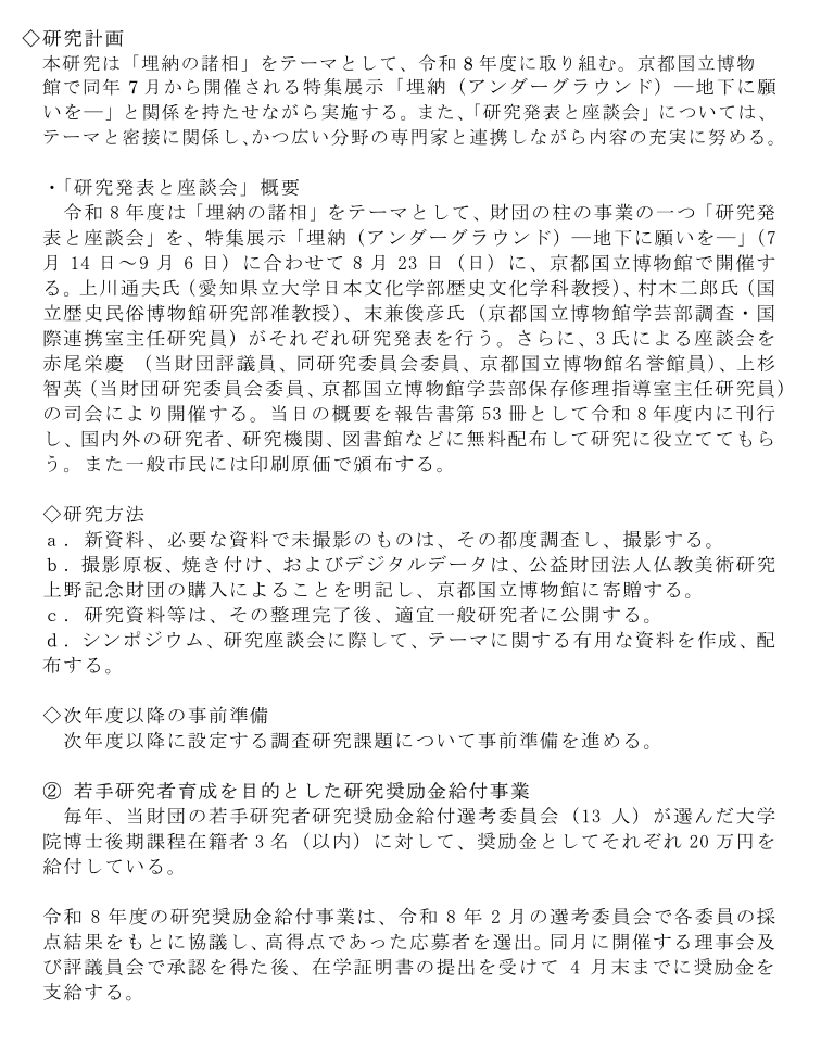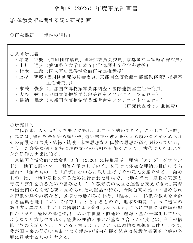 絵画・彫刻・書跡・工芸などの諸分野を縦断する形で資料を収集し、研究を行う。加えて、資料の公開、研究座談会の開催を通じて仏教美術研究の発展に資せんことを期するものである。